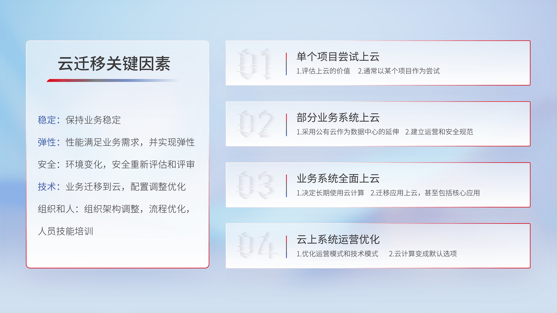结合实际业务,,,,从规划设计、、、、云平台选型、、、、云原生改造、、、、数据迁移、、、集成交付,,迁移全过程为客户识别最佳上云路径,,,做好风险识别管理,,,,设计网络架构、、、身份权限、、、、安全审计合规、、、操作审计、、、、日志审计、、、监控告警策略、、多站点容灾设计等,,,对云上基础设施进行整体规划,,,提升IT治理水平,,,以满足弹性、、、高可用、、、高性能的需求。。。